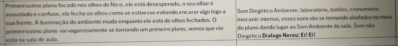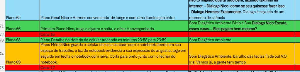 Props e Figurino: A listagem de objetos (cronômetro, jaleco, caixa, teclado, cartazes) revela o cinema como uma arte concreta. A busca por um "cigarro falso" tornou-se um subenredo, culminando em soluções criativas (palito, celular) que, por si só, narram os limites e inventividade da produção independente. A decisão sobre os animais de estimação para estampar a tela do celular de um personagem foi concorrida.